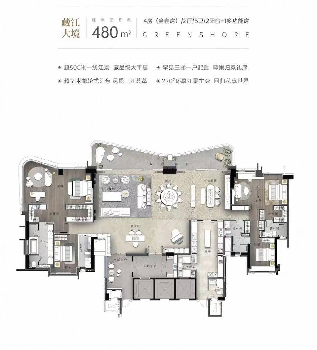 产物亮点:私人电梯入户、部门楼层三面采光、约3.4米层高、动静分区南北对流、约6.8米挑空餐客堂、双厨、四套房设想、部门房间带阳台设想